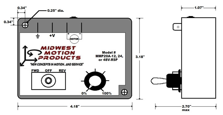 - The MMP 20A-12V-RSP Motor Speed Control operates on 10 to 20 Volts DC.